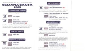 La Semana Santa comenzará el Domingo de Ramos, 13 de abril, con la tradicional bendición de las palmas en la Plaza de las Ollas, seguida por la procesión hasta la parroquia de Nuestra Señora de la Asunción y una Santa Misa Solemne. Este acto inaugural marcará el tono de una semana donde cada jornada tendrá su propio significado.