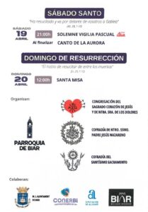 El Sábado Santo, 19 de abril, se celebrará la Solemne Vigilia Pascual a las 21:00 h, retransmitida por TV Biar. Al finalizar, el tradicional Canto de la Aurora romperá la noche con su mensaje de esperanza. Finalmente, el Domingo de Resurrección, 20 de abril, culminará la Semana Santa con una Santa Misa a las 12:00 h en la parroquia.